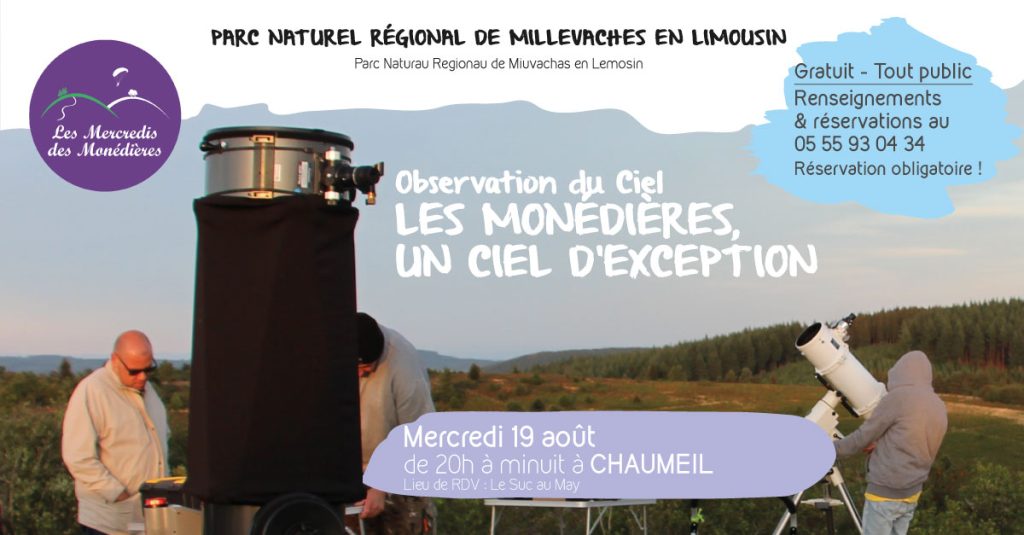 Les étoiles sont à l’honneur cette semaine MERCREDI 19 AOÛT « Les Monédières, un ciel exceptionnel » Dans le cadre des « Mercredis des Monédières » Observation du ciel : tour du ciel avec découverte des constellations et de la mythologie s’y rapportant, puis observation du ciel avec de puissants télescopes pour vous faire observer le ciel […]