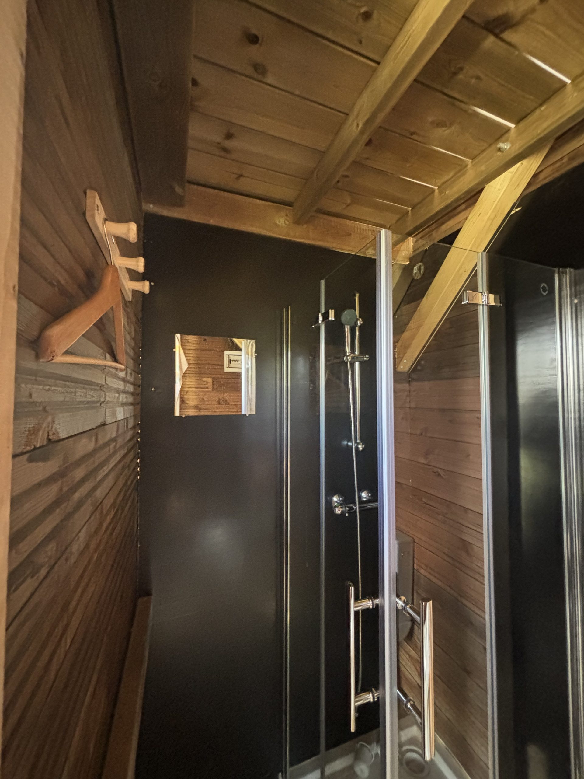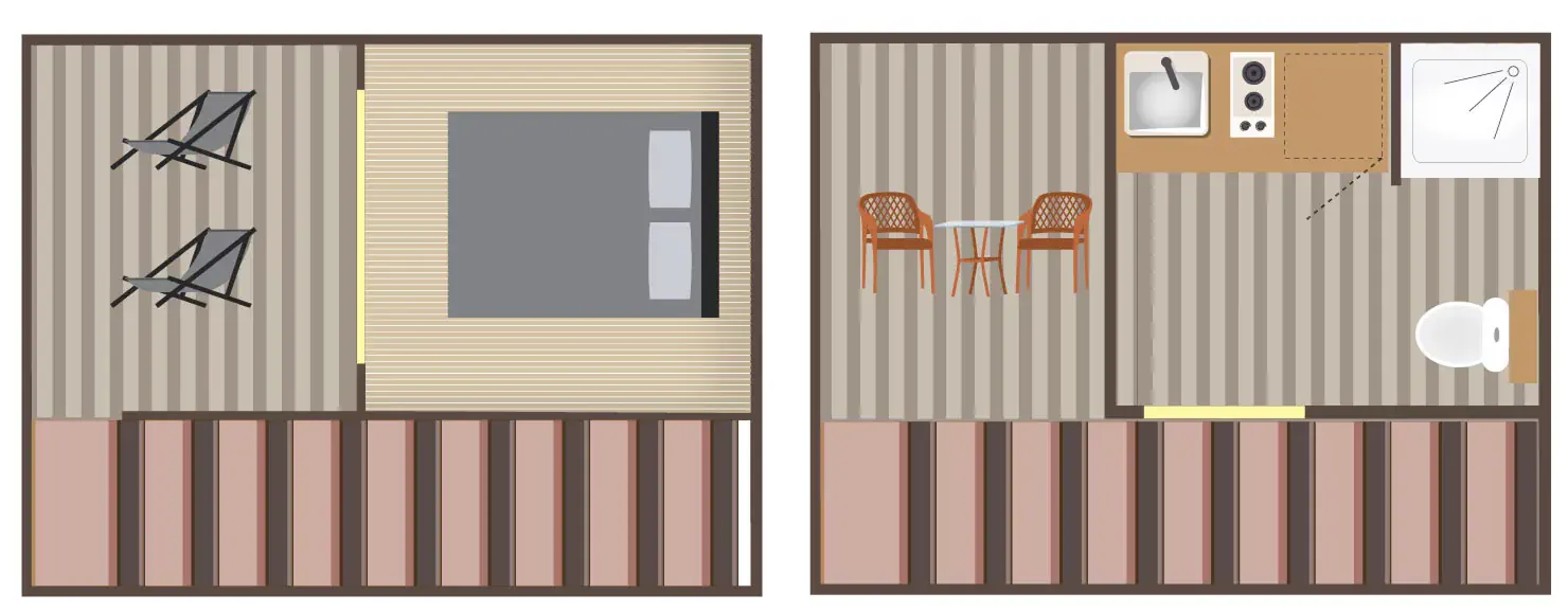 This unusual cabin includes all the comforts you need for a romantic getaway. To make you feel as if you were in a cocoon, the Détente hut includes all the necessary comforts: The 4m2 tent, placed high up, accommodates a 140×190 double bed, made before your arrival. Colored LED lights are integrated directly into the canvas, allowing you to choose your own atmosphere. You’ll find electrical outlets in your unusual accommodation, so you can plug in your cameras, phones, or anything else you need. The best place to enjoy your unusual stay is undoubtedly the fabulous 4m2 high terrace, offering you a breathtaking view of nature. In this cabin, you’ll find all the amenities you need for your stay: a shower room, toilet and fully-equipped kitchenette. To complete your glamping stay, a barbecue is available.