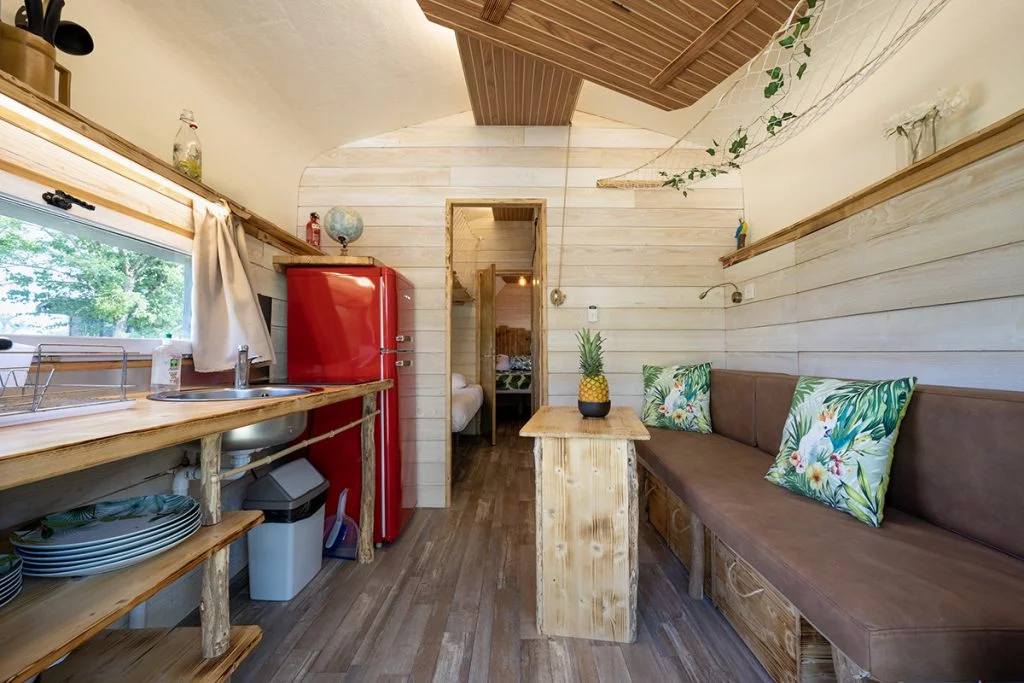 The living area features a fully equipped kitchen and a large, removable table that can be raised to the ceiling to free up space when it’s no longer needed.