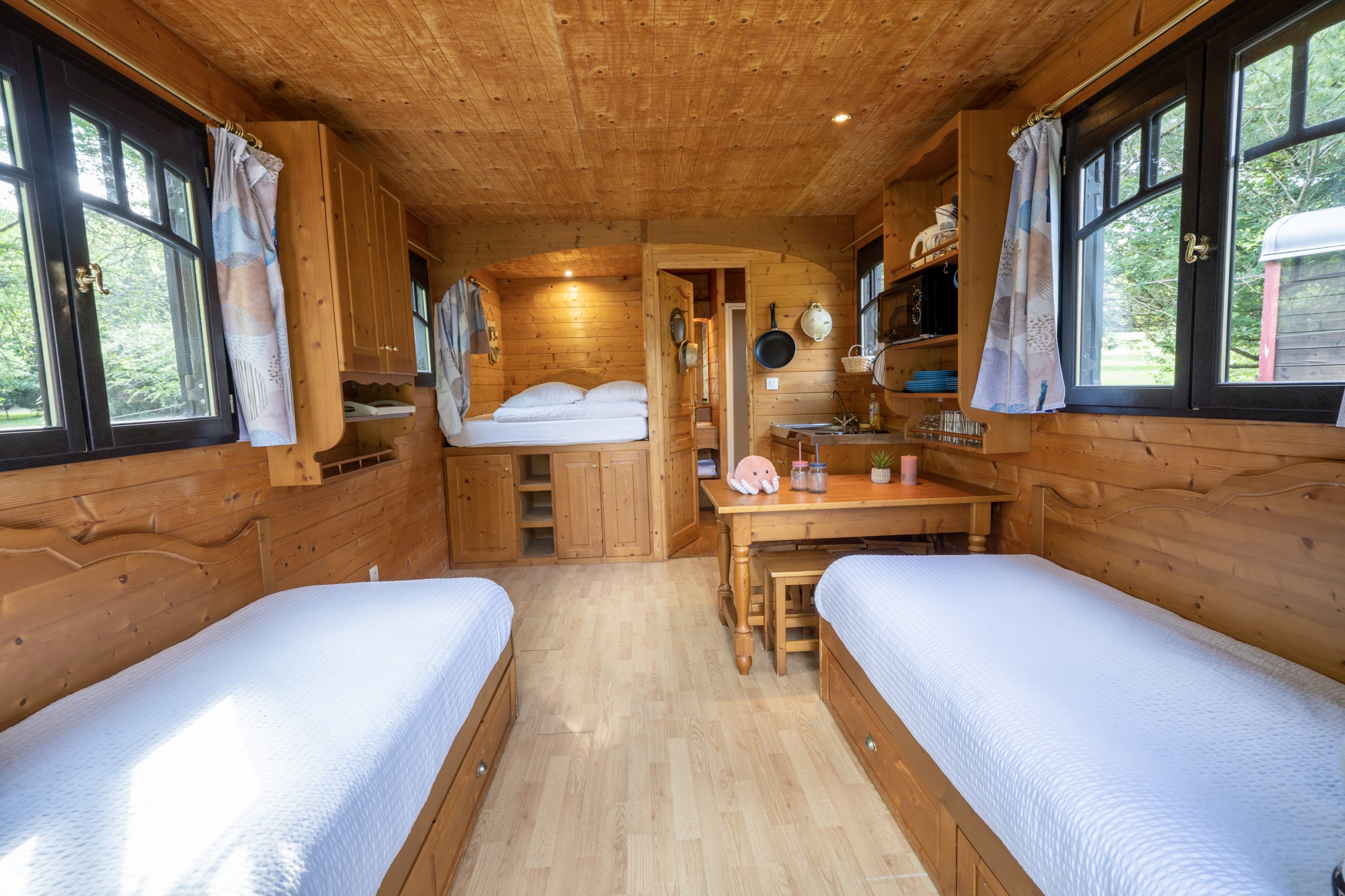 La roulotte gîte peut accueillir jusqu’à 5 personnes. Chacun a son intimité grâce aux espaces astucieusement pensés. Dans le salon, les deux banquettes se transforment en lits simples le soir venu, et un lit tiroir se dévoile également. Un lit en alcôve vient s’ajouter à ce cocon douillet.