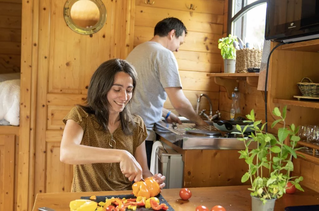 Pour votre confort, une salle d’eau a été intégrée à votre roulotte, et la cuisine équipée vous permettra de cuisiner sur place en famille. Vous pouvez également opter pour l’un de nos délicieux paniers du terroir, idéal pour découvrir les produits locaux !