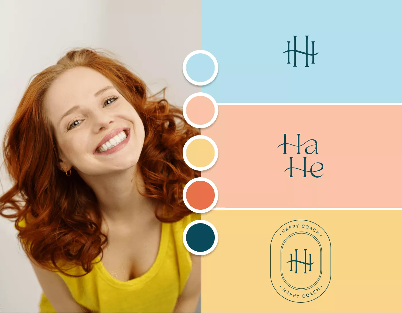 Son logo, arborant une typographie élégante et des vagues délicates, incarne le mouvement, la fluidité et l’équilibre, témoignant de son engagement à guider ses clients vers un bonheur durable à travers une expérience de coaching mêlant élégance, énergie et bien-être. Une identité visuelle distinctive, représentée par une palette de couleurs chaleureuses, telles que le bleu rafraîchissant, le rose énergique, le jaune lumineux et le rouge orangé passionné, permettent de communiquer visuellement les valeurs d’harmonie, de vitalité, de chaleur et de passion qui caractérisent sa pratique.