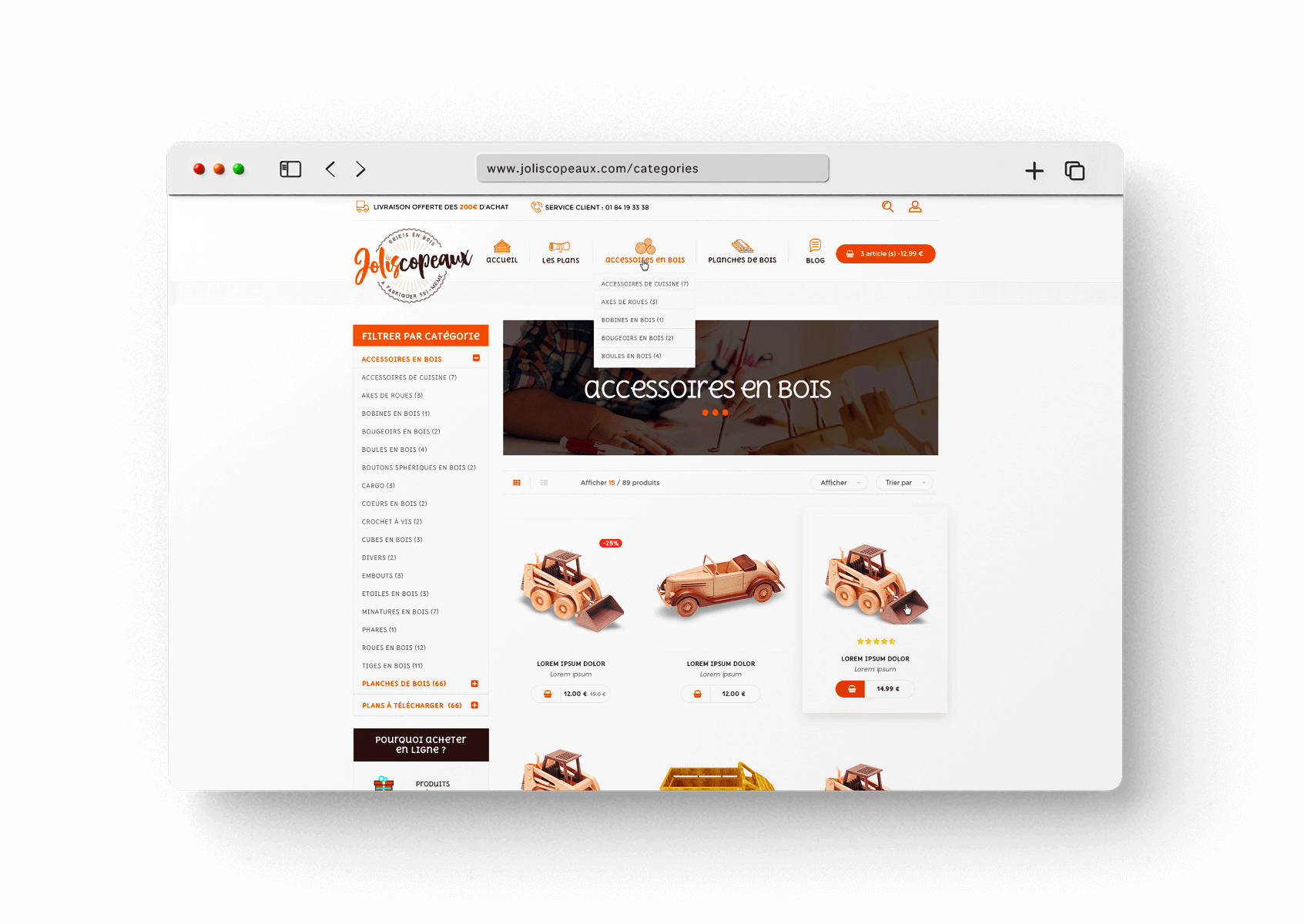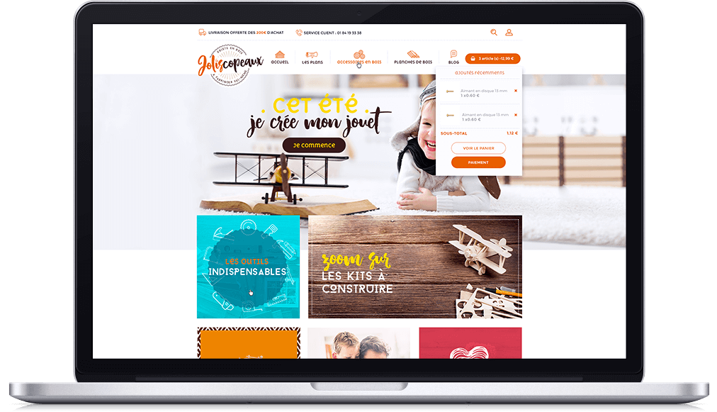 Joliscopeaux est un site de vente en ligne de loisirs créatifs en bois. Il offre des plans, des accessoires ainsi que des kits à construire pour la réalisation des modèles de jouets en bois. L’entreprise s’adresse à une marché de niche notamment ceux qui sont passionnés par le travail manuel et le bois.